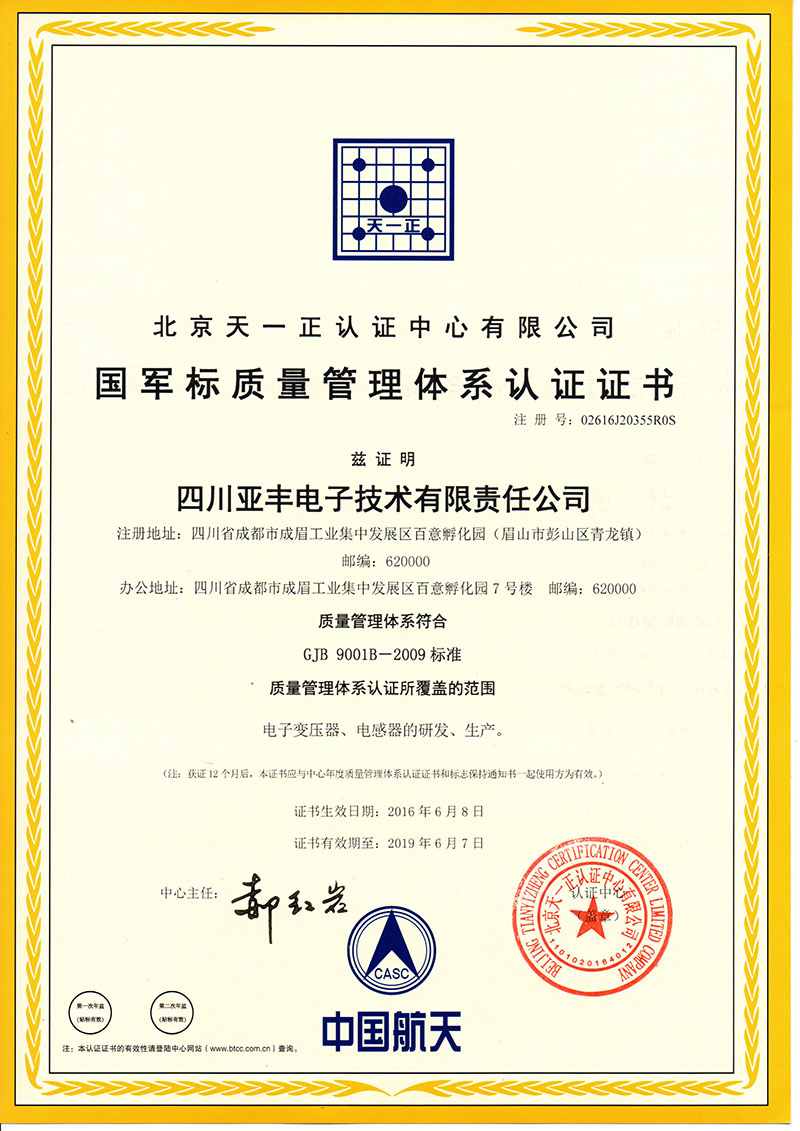 公司于2016年6月5日,通過了北京天一正認(rèn)證中心的現(xiàn)場審核,順利取得GJB9001B-2009國軍標(biāo)質(zhì)量管理體系認(rèn)證證書。